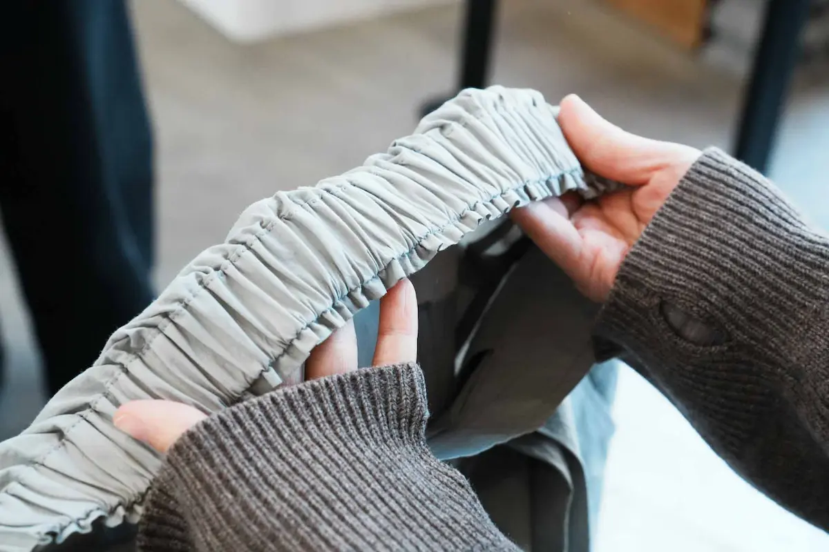 タカ子 今回はウエストがゴム仕様ですが、 ベルト部分の幅も縮むことを見越して、 ほんの少し余裕を持たせて縫っています。 ただ、余裕を取りすぎると、 中のゴムが動いてねじれてしまうことがあるので、 きちんと収まりながら、 動かないギリギリの幅に調整しています。 細かな部分ですが、 こういうところにも技術が必要なんです。