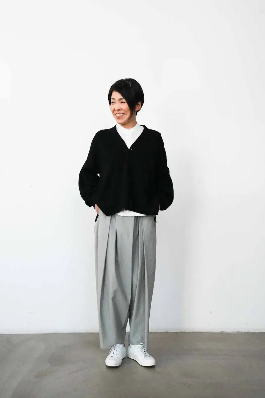 仁美 よろしくお願いします。 ハカマバルーンパンツは、名前のとおり袴が発想源です。 ワイドパンツって、 足の太さが強調されてしまうのが気になるから、と 苦手な方も少なくないと思うんです。 なので、足元を少し細くしたり、 左右で生地の分量に差をつけたりして、 あえてアンバランスな太さにしています。 そうすることで、視線が分散されるんです。