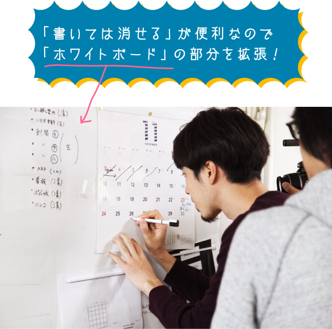 | 清水 | 書き込んだ予定を消すことができるのって、 すごく便利ですよね。 ふつうの家庭とか職場なら この大きさでも十分だと思うんですが うちは、6人くらいスタッフがいるうえに、 それぞれが、 それぞれの締切を抱えているんです。 |