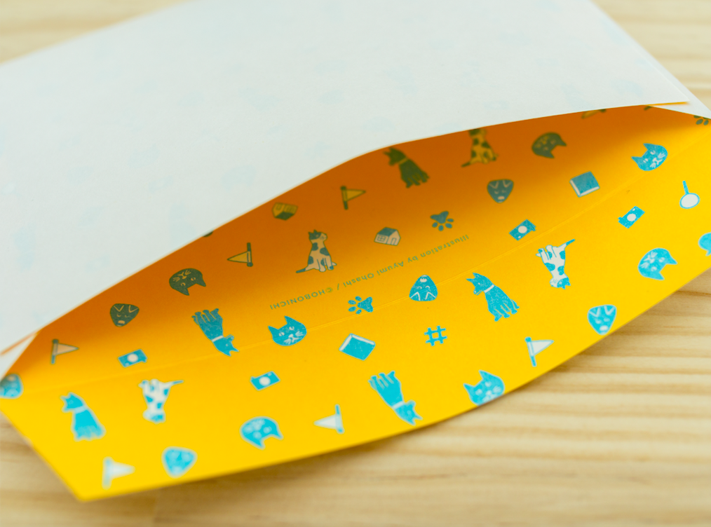 内側にちりばめられたブルーのイラストがかわいい封筒です。