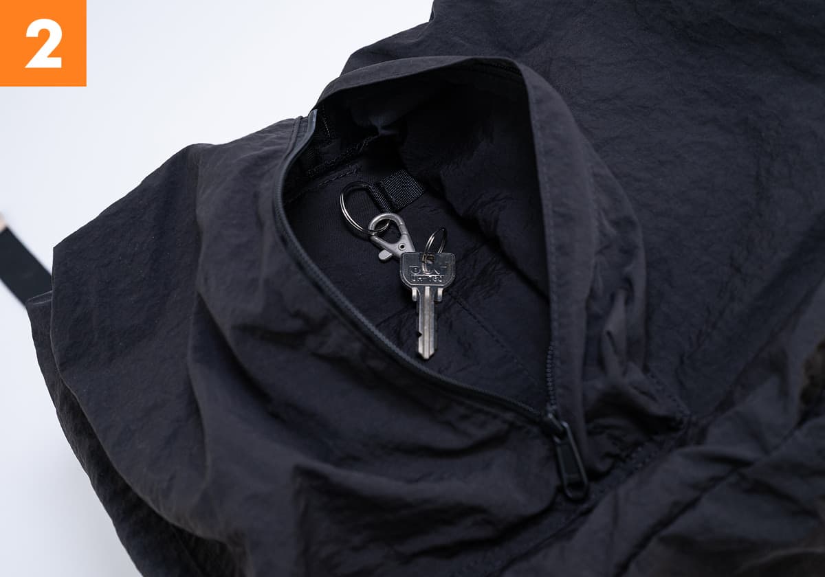 There’s a small pocket in the bag interior where you can keep small objects you want to access quickly, such as keys, earbuds, and lip balm.