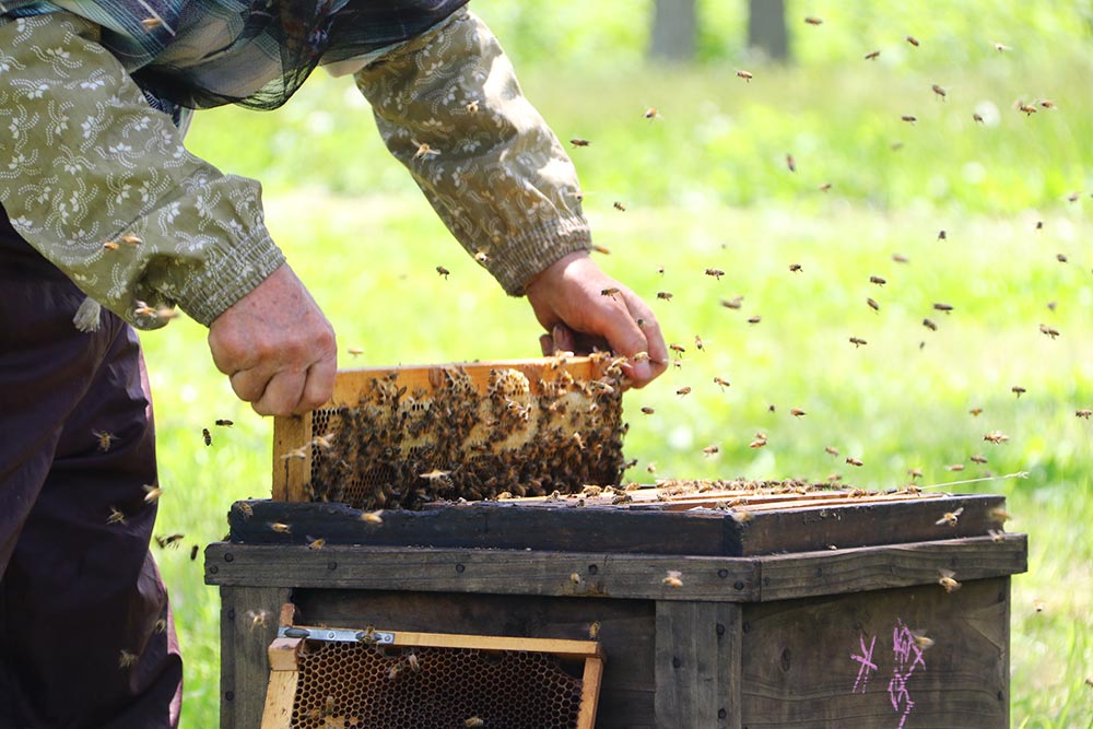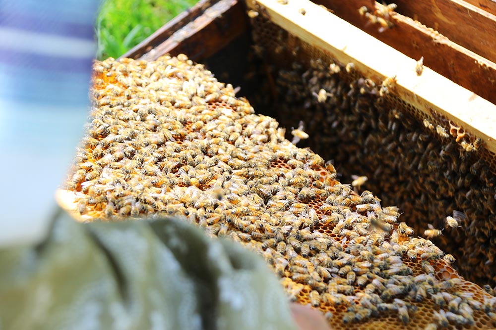 ▲手袋をはめて巣枠を移動。余裕ゼロです。