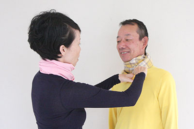 「ほぼ日のくびまき」を巻いてきてくれるんですよ。