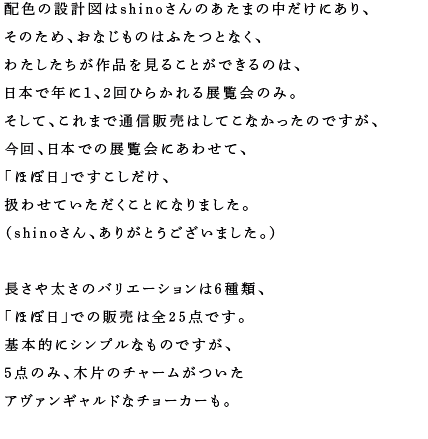 ![]() [shino's bijoux] 【会場】うつわ 良 愛媛県松山市南梅元町934-59 tel.fax. 089 975 4241 【会期】2013年10月18日(金)- 23日(水) 【時間】11:00 - 18:00 会期中無休 |
