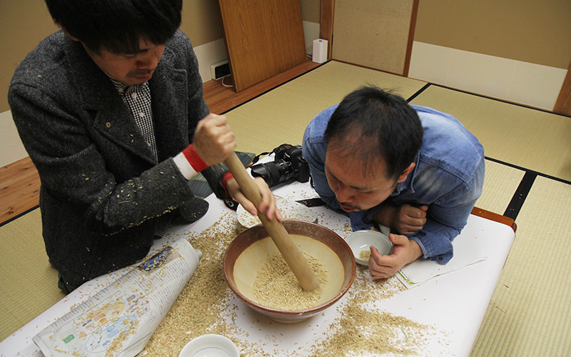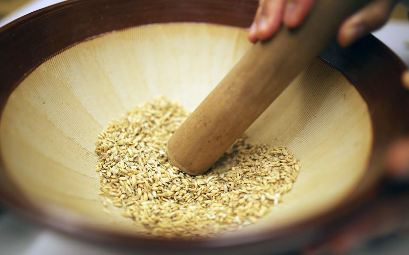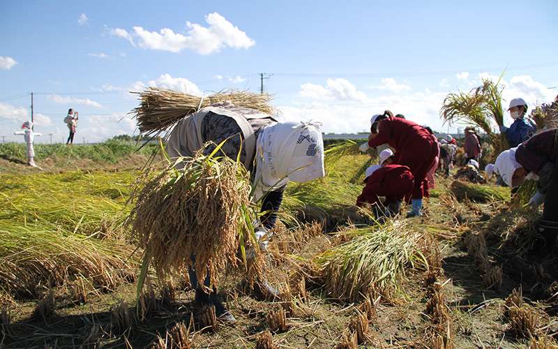 稲を「順手」で握り、根元をカマで刈り取ります。