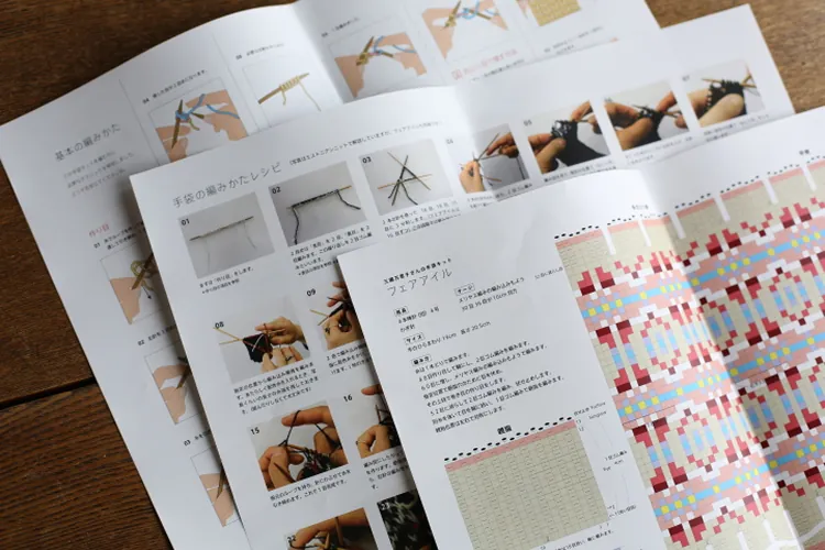 編むのに必要な材料とくわしい編み図のリーフレットがセットで届きます。