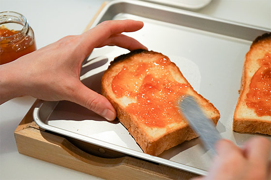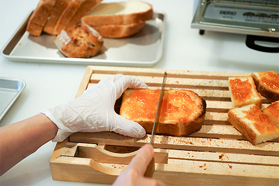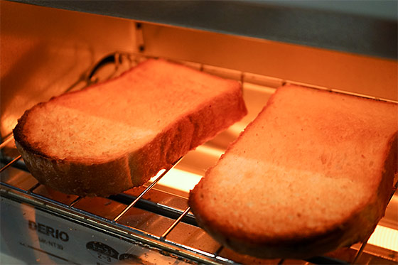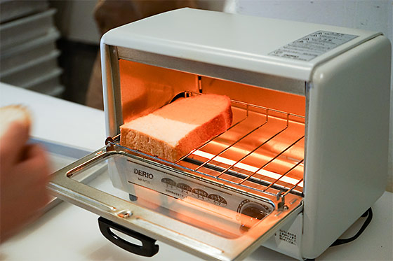 - では、まずパンをトースターで焼いて‥‥。