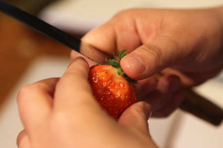 いちごのヘタをとり、たて半分に切る。