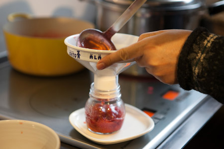 こぼさず安全に、ジャムをびんに詰めることができます。