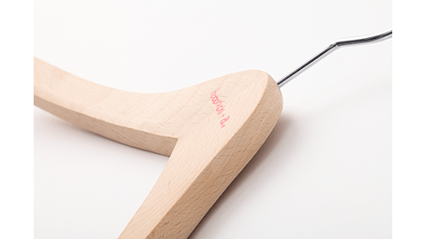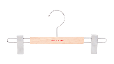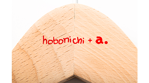 大橋歩さんが書いた「hobonichi + a.」のロゴ入りの、天然木・無塗装のオリジナルハンガーです、創業60年を超える、専門の工芸会社さんに制作を依頼。肩のライン、長さ、厚み、素材など は すべて大橋歩さんといっしょに決めました。ハンガー(レディス)より少し大きめの 男性サイズ、ハンガー(メンズ)も用意しました。今回販売する洋服には、トップスにはハンガー、ボトムスにはズボンかけが1着につき1点、「ほぼ日スト ア」の特典としてついています。