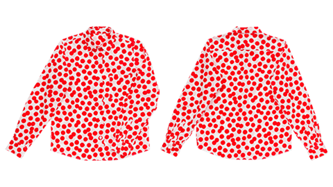白地に、元気な赤。踊るようなランダムなみずたまの布地は、大橋さんがひとつひとつ切り絵をして、並べ、デザインしたオリジナルプリントです。シャツのかたちは、オーソドックス。ほどよい大きさの角襟で、台襟もあり、肩ヨークもついています。裾はゆるやかにカーブがあって、ボトムにインでも、アウトでも。タイトめに着ても、大きめのサイズをゆったり着ても、どちらもカッコよく決まります。布は薄手で肌触りのよい、上等なブロードです。