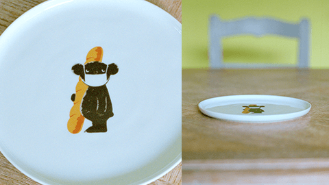パンを持った「誤解されやすいくま」が描かれた、やや小ぶりのパン皿です。かたちは、浅く、底が平らな平皿。底に釉薬がかかっていない平皿に絵付けをすると、割れてしまうことがあるため、ごく浅くて広い、三重の高台をつけてクリアしています。毎朝の食卓で、くまに出会うのもよし、小物をおくためのプレートがわりにしても、よさそうです。
