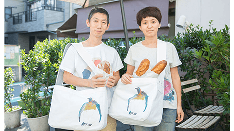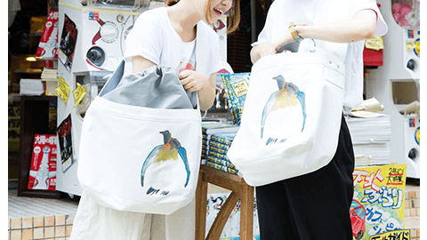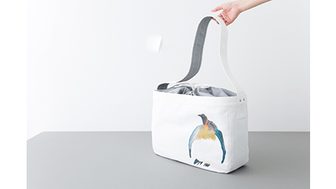ミロコマチコさんのペンギンの絵をフロントに大きくあしらいました。帆布の色は、きなりではなく、真っ白。中身が飛び出さないようにひもでしばる巾着タイプのふたをつけました。内部には小物を整理するのに便利なポケットもついています。肩から下げるスタイルが基本ですが、ホックをとめれば手持ちもOK。アクセントカラーはブルーとグレーの2種類を用意しました。丈夫で、大容量。国内生産。ぜひ、この夏の相棒にしてください。