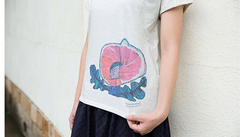 ミロコマチコさんが『忘れてきた花束。』のために描きおろしてくださったイチジクの絵を大胆にレイアウトしました。生地は、やわらかいグレーが淡くミックスされたオートミール。ほかにはない個性と大人っぽさをあわせ持つ特別なTシャツができました。