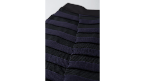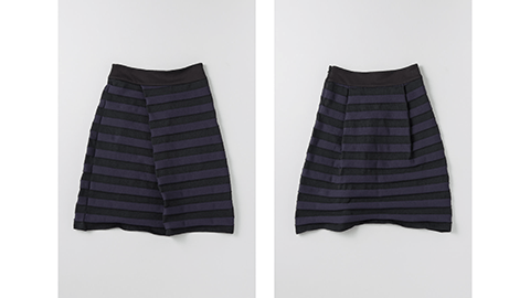 ブラックとネイビーのボーダースカート。軽いニットで編まれているので身につけたとき、柔らかい素材ならではのふんわりとした動きが出ます。「ボリューム感を持たせるために、前身頃の部分を折り返しているのではいたときに、ちょっとしたアクセントになります。ボーダー部分は、実は表地と裏地。交互に凹凸の出る編み方になっています。ウエスト部分はニットでなく布帛なのできちっとはくことができます」(デザイナー渡邉良重)