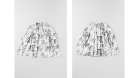 春夏で反響の高かった、ラグランのブラウス今秋冬では、長袖バージョンが登場。「前回、とても着やすかったので、秋冬も着たいなと思ってつくりました。グラフィックはふるい図鑑にあるような植物の絵柄を描いたり組み合わせたりしました。襟元にはギャザー、着たときに裾が広がるシルエットです。秋冬なのでタートルネックを合わせてもいいかもしれませんね」(デザイナー渡邉良重)