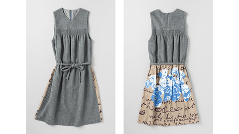 2014年の秋冬に販売して大好評だった「ギャザーワンピース」をリニューアルしました。前回は表裏で着こなせる仕様でしたが今回は「後ろ身ごろ柄」に。「ディケンズの小説の文字に、わたしが撮ったつるバラの写真を重ねました。下はTシャツでも、ブラウスでも。ウエストはたくし上げず、腰のあたりですとんと落として着るのがいいと思います。ベルトは共布でつくりました」(デザイナー渡邉良重)