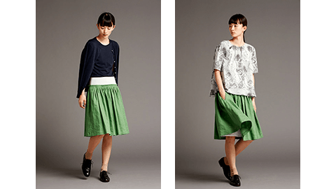 CACUMA定番アイテムの麻のギャザースカート。回を重ねるごとに改良を加えてきました。「今回は、ちょっとだけ、丈を短く。このスカートは、ウエストではいても、腰に下げてはいてもいいんです。そうすることで丈の長さも微妙に調節できます。派手さを抑えた黄緑なので実際にはいてみると、見た目の印象より自然に着られると思います。ウエストをストレッチ素材にすることではいたときのボリューム感を抑えています」(デザイナー渡邉良重)