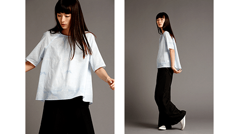 2013年の春夏にはじめてお目見えした、ラグランのブラウス。着やすさと女性らしいシルエットでたいへん好評です。今季は、後ろ身ごろのパターンに余裕をもたせました。胸元には、ギャザーが入っています。涼しげに着られる、淡い海色のブルー。袖は、五分丈。半袖よりは長く、肘が隠れるくらいです。