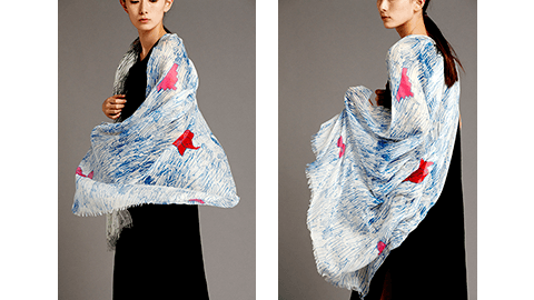 毎回、大人気の大判ストール。幅約85cm × 長さ約200cmの大きさなのに非常に細い糸で織られているためカバンに入れて持ち歩くことができます。渡邉良重さんならではのボールペンによる「ラクガキ」です。川の水面を思わせる涼しげな色あいに、赤いバラなどのモチーフがポイント。これを、一枚一枚、職人さんが手で刷る「手捺染」 で印刷しました。「このストール、一年中持ち歩いています。飛行機の中や映画館など夏でも冷房が効きすぎているような場所ですごく重宝するんです」(デザイナー渡邉良重)