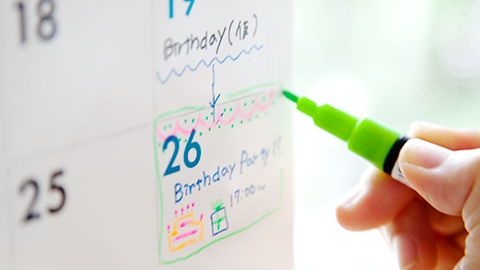 大事なイベントや、お絵かきにも使える、蛍光色のマーカーです。ホワイトボードマーカーのイレーザーでは消せないインクを使っているので、間違って消したりしたくない予定を書くときにも。消すときは、ティッシュや柔らかい布を水で濡らして拭き取ってください。