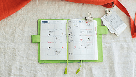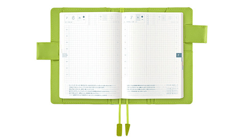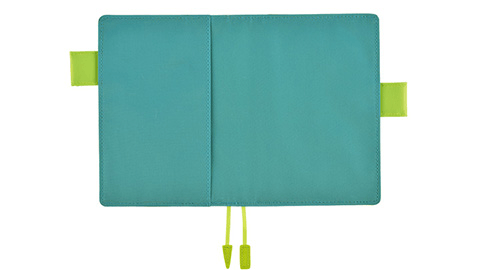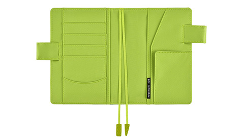 光沢のある明るいブルーグリーンは、毎日の喜怒哀楽をぜんぶ受け止めてくれそうなさわやかでやさしい色合いです。一転、中面の目の覚めるような黄緑は、手帳を開くたびに気分を高めてくれそう。相反する二つの雰囲気がひとつになって、ふしぎとしっくりなじむカバーです。