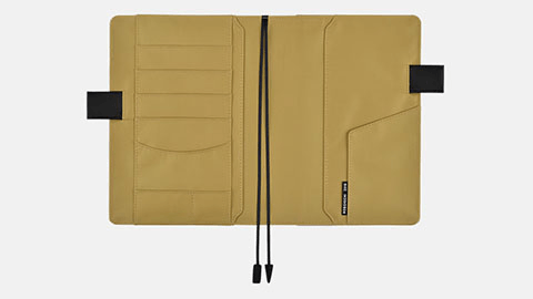 「ブラック×ベージュ」は、外観はシックなブラック一色の手帳。しかし中面を開いてみると、イエローオーカーとも呼ばれる、濃いめのベージュ。光沢があることで、カジュアルさのなかにも品のある印象になりました。ピシッと締まった感じにやわらかさの加わったカバーは、ビジネスとプライベート、両方の要素をたっぷり書き込めるカズンにぴったりです。