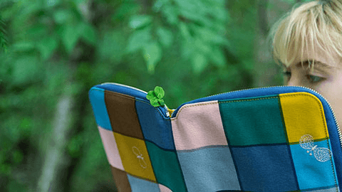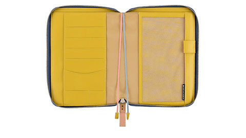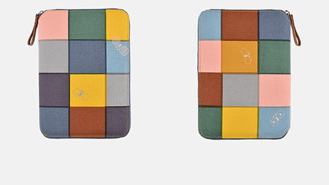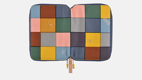 甘いジェリーが並んでいるような格子柄の上に、かわいらしい刺繍のちょうちょが舞うジッパーズタイプのカバーです。生地は、9色のインクを1色ずつ重ねながら、手間ひまかけてプリントされたもの。そのため、隣り合う色どうしが重なる部分などに、手作りならではの味わいがあるのも特長です。内側はきれいなマスタードイエロー。経年変化もたのしめるヌメ革の引き手には、「ミナ ペルホネン」オリジナルのちょうちょのカシメがついています。