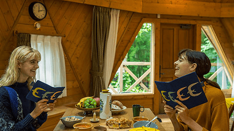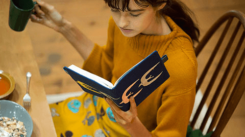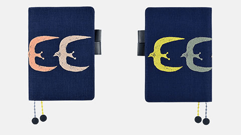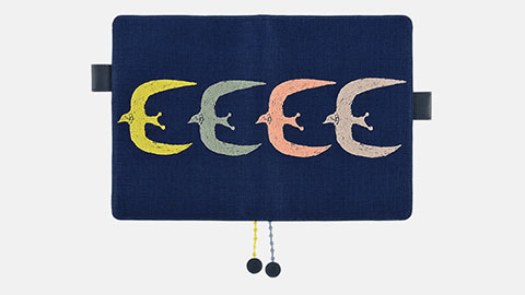 大きな翼を広げて羽ばたく鳥たちを手描きの図案をもとに、4色の刺繍で表現しました。鳥の目や羽の向きに沿ったカーブの部分など細かなところにまでていねいな仕事のぬくもりが感じられます。刺繍が映える紺色の生地には目の粗いざっくりとしたリネンを選び内側やバタフライストッパーには少し光沢のある明るい紺色の合皮を合わせました。ぽこぽことした立体感のある2色のしおりひもは、刺繍の技法で作られた特別なもの。「ミナ ペルホネン」の世界を刺繍ならではの立体感や手触りとともにたのしんでいただけます。