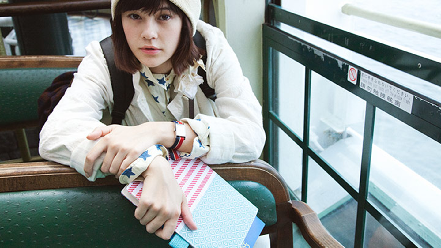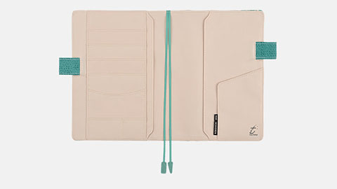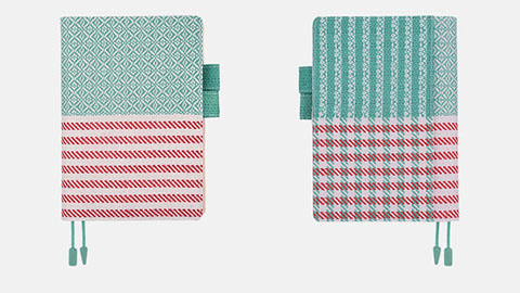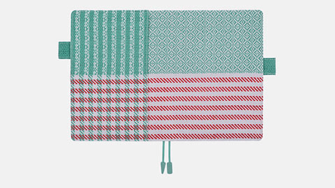 ボーダーと複雑な模様が重なった「Marinière(マリニエール)」は、trois tempsの作るトートバッグのなかで人気ナンバーワンの柄なのだそうです。手織りの温かみとともに、ミントグリーンのさわやかな色合いと美しいボーダー柄がマリンテイストも感じさせます。ポケット部分はさらにミントグリーンの縦縞が加わっているので、手帳の表と裏で違った表情が楽しめます。