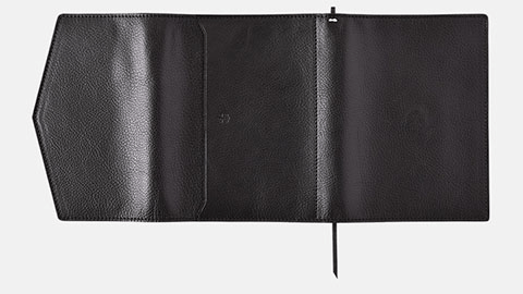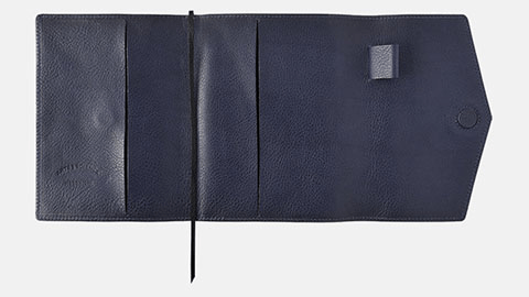 内側にも外側と同じ革を使ったぜいたくな仕様です。表側はマットなブラックを、内側には深みのあるネイビーを選び、大人の上品さを追求しました。持つ人や使うシーンを選ばない使い勝手のよさがうれしいカラー。色鮮やかなペンといった小物とのコーディネートも相性がよさそうです。
