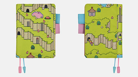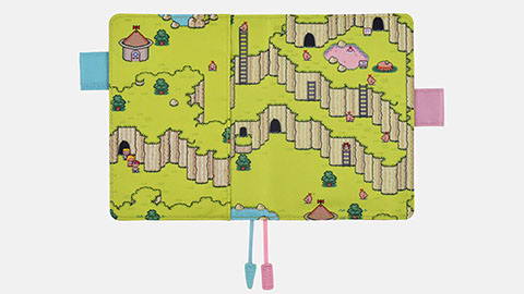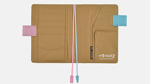 糸井重里がシナリオを手がけた1994年発売のスーパーファミコン用ソフト『MOTHER2 ─ギーグの逆襲』のコラボレーションカバーです。どせいさんの村「サターンバレー」に到着したときの村のようすがカバーになっていて、たくさんのどせいさんのほか、ネス、ポーラ、ジェフの姿も見つけられます。バタフライストッパーは温泉のピンクと、池の水色。内側は明るいブラウンで、端には『MOTHER2』のロゴが白でプリントされています。ゲームプレイ中のわくわくする気分が思い起こされるようなカバーです。ちなみに外側のポケットの中には「つっぱりダック」が隠れています。