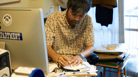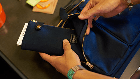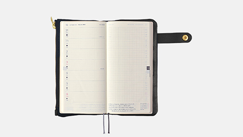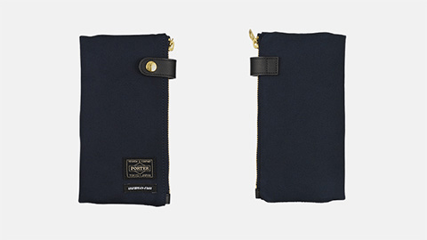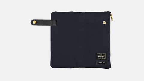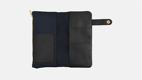 B印YOSHIDA × PORTERとのコラボレーションで、まったく新しい形のWEEKSカバーができました。軽くてやわらかく、くるっと包むように持ち運べる形のおもしろさから、「サンドウィッチ」と名づけました。外側には、文房具やコード類をまとめて入れておけるジッパーつきポーチがあり、ボタンを開いた内側には、牛革に切れ込みを入れて作ったポケットもあります。深いネイビーの「ミッドナイト」はスマートな印象のカバーで、ボタンやジッパーのゴールドが際立っています。ファッションの定番色ということもあって、どのWEEKSの色とも合わせやすいカバーです。
