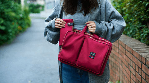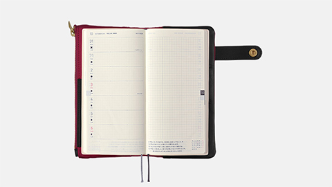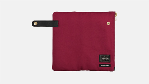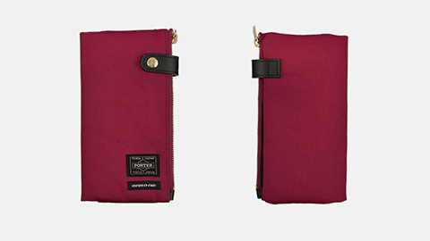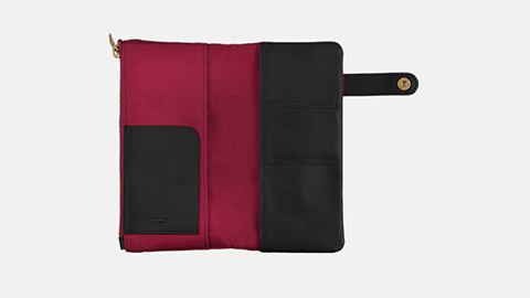 B印YOSHIDA × PORTERとのコラボレーションで、まったく新しい形のWEEKSカバーができました。軽くてやわらかく、くるっと包むように持ち運べる形のおもしろさから、「サンドウィッチ」と名づけました。外側には、文房具やコード類をまとめて入れておけるジッパーつきポーチがあり、ボタンを開いた内側には、牛革に切れ込みを入れて作ったポケットもあります。赤紫色の「ワイン」は、ゴールドのジッパーと組み合わさることでエレガントな印象になりました。机に置いてあるだけでも目を引きそうな存在感のあるカバーです。