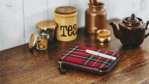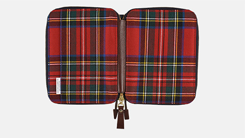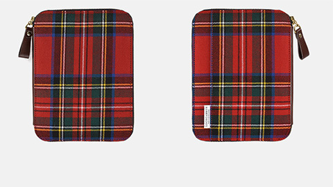 レッドを基調に、ブルーやイエロー、ホワイトなどのラインが入った明るい色彩のチェック柄。「Royal Stewart」(ロイヤル・ステュワート)と呼ばれるこのデザインの生地は、英国女王陛下の衛兵が着用し、時代を超えて愛されるクラシックなデザイン。マフラーやストールでも人気の柄です。ジッパーズの背に施された革ともしっくりなじみ、男女問わずお使いいただけます。