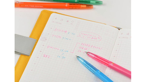 書いた文字を消すことができる筆記具「フリクションシリーズ」の極細ボールペンです。筆跡が乾いてから、頭部の専用ラバーでこすると摩擦熱で文字を消すことができます。いちど書いたあとでも消せるので、変更の多いスケジュールの管理にも向いています。0.38ミリの文字の細さはたくさんのメモをとるときにも便利。また、インクの減りが少なく長く使えるのも特長です。ペン自体も細身でかさばらず、携帯に向いています。