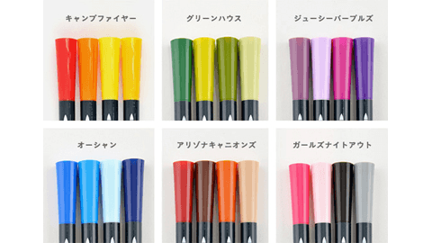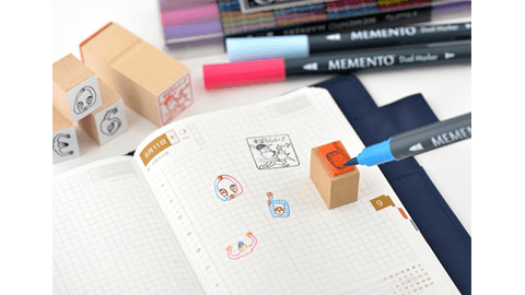 1952年設立のスタンプインクメーカー「ツキネコ」の、スタンプ台の代わりになるペンです。透明感のある美しい色が特徴の水性マーカーで、このペンがあればスタンプ台を持ち歩く必要がありません。版面に直接インクを塗ることで、スタンプ台では難しい色の塗り分けも可能です。太目のブラッシュと極細のツインタイプ。もちろん普通のカラーペンとしても使えます。