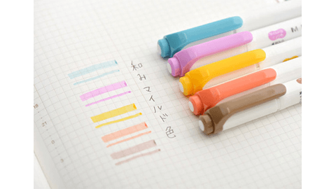 毎年人気の、やわらかい色合いの蛍光ペンのセットです。従来の蛍光ペンに比べて淡い色合いで目がチカチカしにくいのが特長。1本で太字と細字を使い分けられます。時間軸にそって方眼を塗りつぶしたり、大事なメモの部分を強調したりするのにお使いください。裏抜けもしにくく、「ほぼ日手帳」との相性は抜群です。