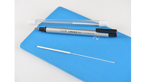携帯しやすい、ペンのかたちをした消しゴムです。クリップつきなので、ほぼ日手帳のバタフライストッパーにさして持ち歩くことも可能です。消しゴムは、2.3ミリの丸型。消したい箇所だけを狙って消すことができ、快適な使い心地です。別売の替え消しゴムもご用意しています。