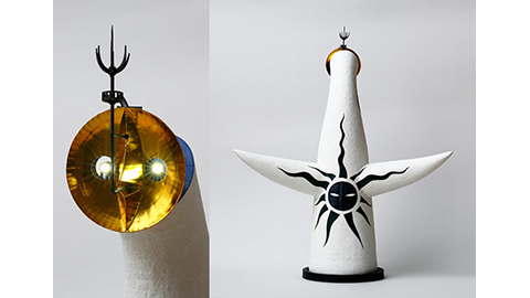 <1/144スケール 太陽の塔>1970年に開催された大阪万博のテーマ館のモニュメント「太陽の塔」の、1/144スケールのソフトビニール製モデルです。(全長約50cm)黄金の顔は金メッキ加工をほどこし、より実物に近い質感を表現しています。スイッチを押すと、左右の目にとりつけられたLEDライトが点灯します。製作は、質の高いフィギュア作りに定評のある株式会社海洋堂が担当しています。設置用の丸型ベースと、発光用のボタン電池が付属しています。