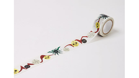<マスキングテープ(太陽の塔)>「太陽の塔」の顔の部分が並ぶ、マスキングテープです。24ミリ幅で、手帳のページや封筒の端などにちょっと貼るだけでちょうどいいアクセントになります。使いやすいデザインも特徴です。