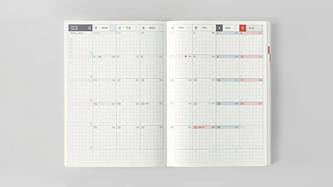 スペースがたっぷりある「1日1ページ」タイプ。書きやすさを追求して行き着いた「3.7ミリ」の方眼は、印刷を薄くしてあるので、マス目を気にせずに使うこともできます。予定を書くだけではなく、写真やチケットを貼ったり、絵を描いたり、ノート代わりにメモしたりするなど、自由に使えるのが特長です。