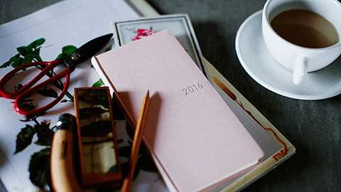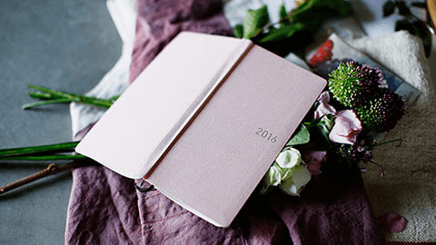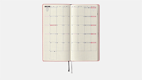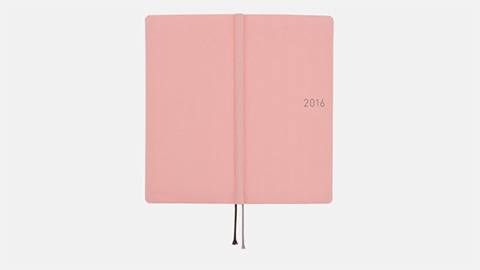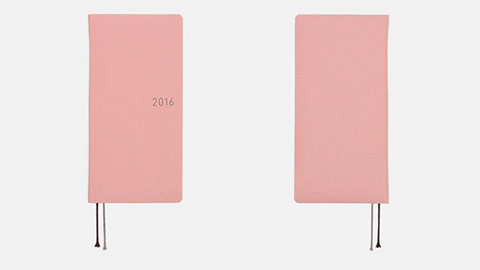シンプルながら個性的な5色の「カラーズ」。ザラッとした手触りの表紙にはドイツの書籍装幀用の生地が使われていて、洋書のような雰囲気をかもし出しています。やわらかな印象の「ペールピンク」に合わせて表紙の「2016」にはグレーを選び、春の空気をイメージしました。かわいらしく、落ち着きのあるピンクで、大人が持つのにもちょうどいい色合いです。印象を変えてみたいときには「柄入りクリアカバー」との組み合わせもおすすめ。
