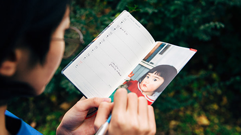 写真家の川島小鳥さんが、佐渡島で出会った女の子を撮影した写真集『未来ちゃん』。「ほぼ日手帳 WEEKS」の表紙として、写真集には収録されていない、はじめての海外旅行に出かけた「未来ちゃん」の写真を使用しています。写真集のような装丁にするために、表紙には光沢のある表面加工をして、「2016」の年号も空押しにしました。「屋根うらの窓」の表紙で使用している写真は、天窓からひょっこり顔を出した「未来ちゃん」がパリの街並みを眺めているようすで、表紙から裏表紙にかけて、一枚の写真になっています。表紙と裏表紙の見返しにも、初めての街で、初めての文化に触れてはしゃぐ写真をプリントし、写真集を持ち歩けるような手帳です。また、特典の下敷きには佐渡島で撮影した、すまし顔とおどけた表情が印象的な写真を収録。しおりは、赤と青の2色です。おかっぱ頭に、真っ赤なほっぺ、天真爛漫な表情を浮かべる「未来ちゃん」がいつでもそばにいてくれるような手帳です。