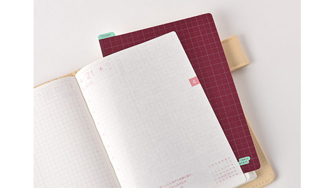 ほぼ日手帳オリジナル・カズン・WEEKSのそれぞれのサイズに合わせた専用下敷きです。カバーのポケットにものを入れたときにページがでこぼこして書きづらいと感じる方や、筆圧が強めで次のページにペン跡がつくのが気になる方におすすめです。また、下敷きの前面は5ミリ方眼。長辺には1ミリ刻みの目盛がついているため、定規としても使うことができます。角に「TODAY」のタブが入っていて、手帳にはさんだときに「今日」のページを示す「しおり」としても機能します。2016年版はワインレッドとミントブルーの色の組み合わせ。手帳にはさんだときに、ちょっとしたアクセントになります。
