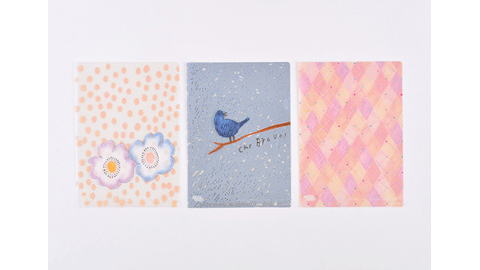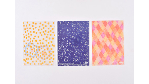 ほぼ日手帳オリジナルと同じA6サイズのクリアファイルのセットです。ことしのオリジナルサイズのデザインは、デザイナーの大谷有紀さんの手によるもの。手帳にはさんだときの雰囲気もかわいい 優しい色合いの3枚セットです。それぞれのクリアファイルは、片面ずつ柄が違うデザイン。重ねて見える柄と、メモや写真などをはさんだときの柄の見え方が変化しますから、立体的な表情の変化をたのしめます。