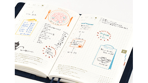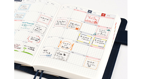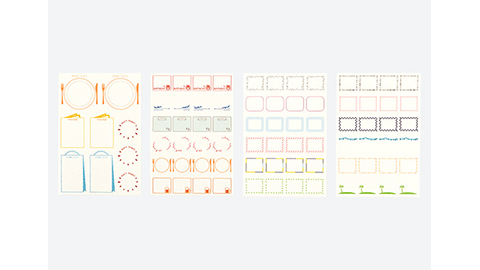 ほぼ日手帳オリジナルの「月間カレンダー」のページに合わせて作ったフレームタイプのシールです。さまざまな種類があり、マス目に合わせて貼るだけで手帳のページがにぎやかに、たのしくなります。上から文字を書くこともできます。また、「1日ページ」用の大きいサイズのシールも入っています。