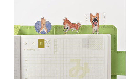 「雲がうまれる」さんといっしょに作った柴犬のイラストの透明なブックマークです。手帳の上に飛び出すように貼るプラスチックタイプのブックマークで、なんども貼ったりはがしたりして使えます。1つだけ貼っても、並べて貼っても、手帳のすてきなアクセントになります。全6種類が、各3枚ずつ入っています。
