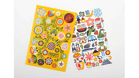 イラストレーターの福田利之さんが描いた手帳に貼ってたのしめる、4種類のシールです。あたたかみのある、やさしい色合いのイラストはどことなくノスタルジックな印象で、貼ったページにすてきな気分を添えてくれます。オリジナルのカバーにちょうどはさめるサイズなのでいつも持ち歩くことができます。1日ページにも使いやすい「flowers」「seasons」「animals」「others」の4シートです。