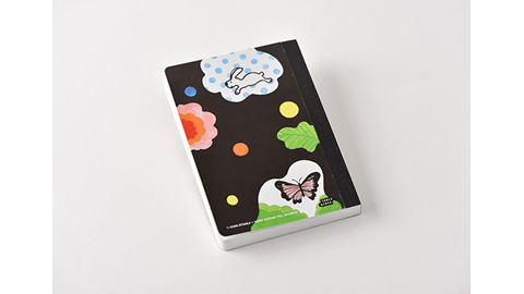 155枚の用紙が1冊にまとまった、文庫本サイズのメモ帳です。1ページごとにスッとちぎれる製本で、ちょっとしたメモを書いて誰かに渡したいときにも便利です。ことしのデザインはイラストレーターの大塚いちおさんにお願いしました。黒を基調にした表紙には「hobonichipaper(s)」のことばとともに、かわいい鳥や蜂、うさぎや蝶、花などの絵が描かれています。中のペーパーは無地ですが、ワンポイント、大塚さんの鳥のイラストが明るい水色で印刷されています。